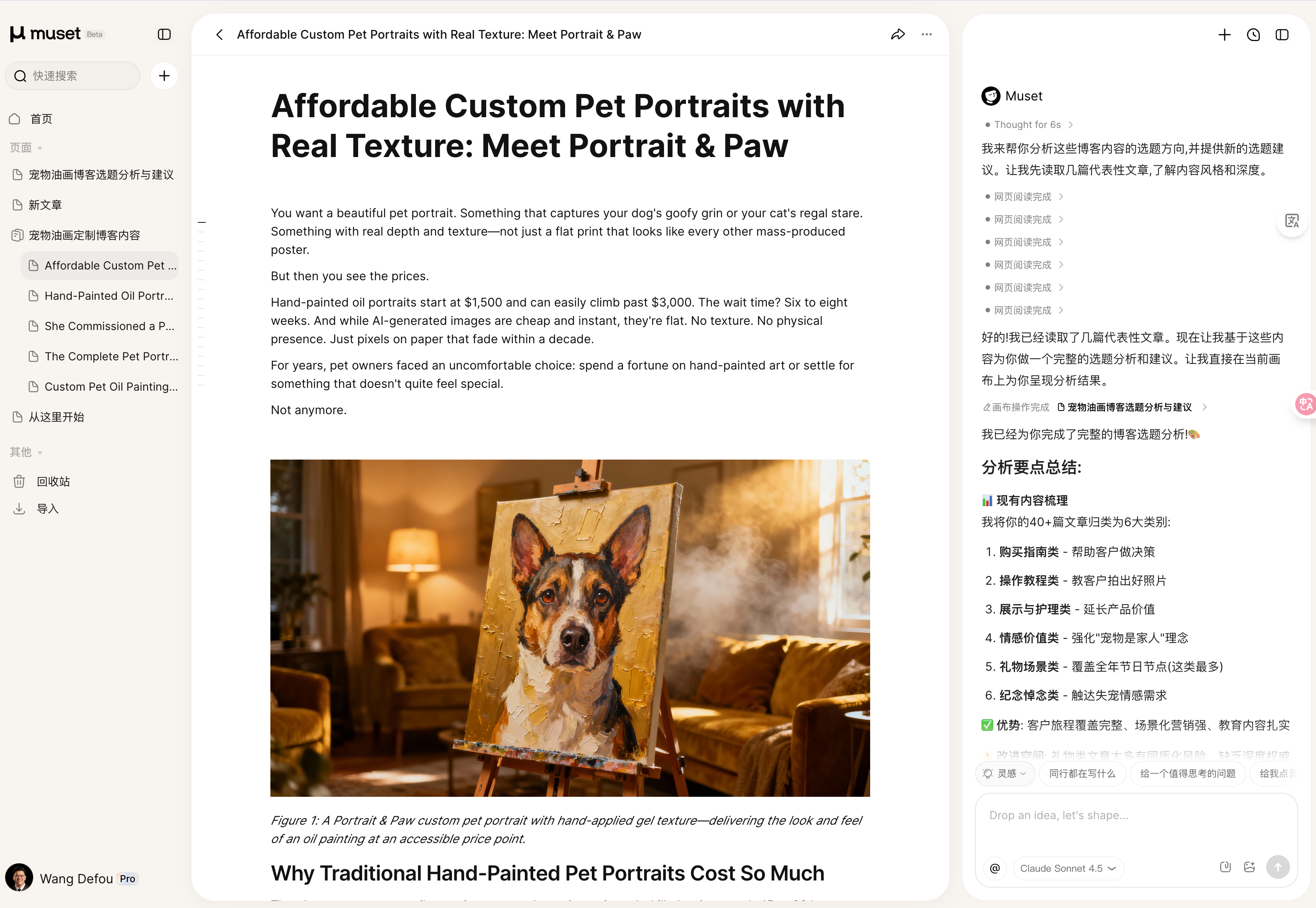 这个时候,刚好又接触到Muset这个新产品,体验了一番之后,发现比起YouMind,Muset 更适合沉浸式创作,我最近急需的博客内容生产刚好用的上,就像Sherry分享的那样:“有了Muset,又可以快乐地Vibe Creating了。”