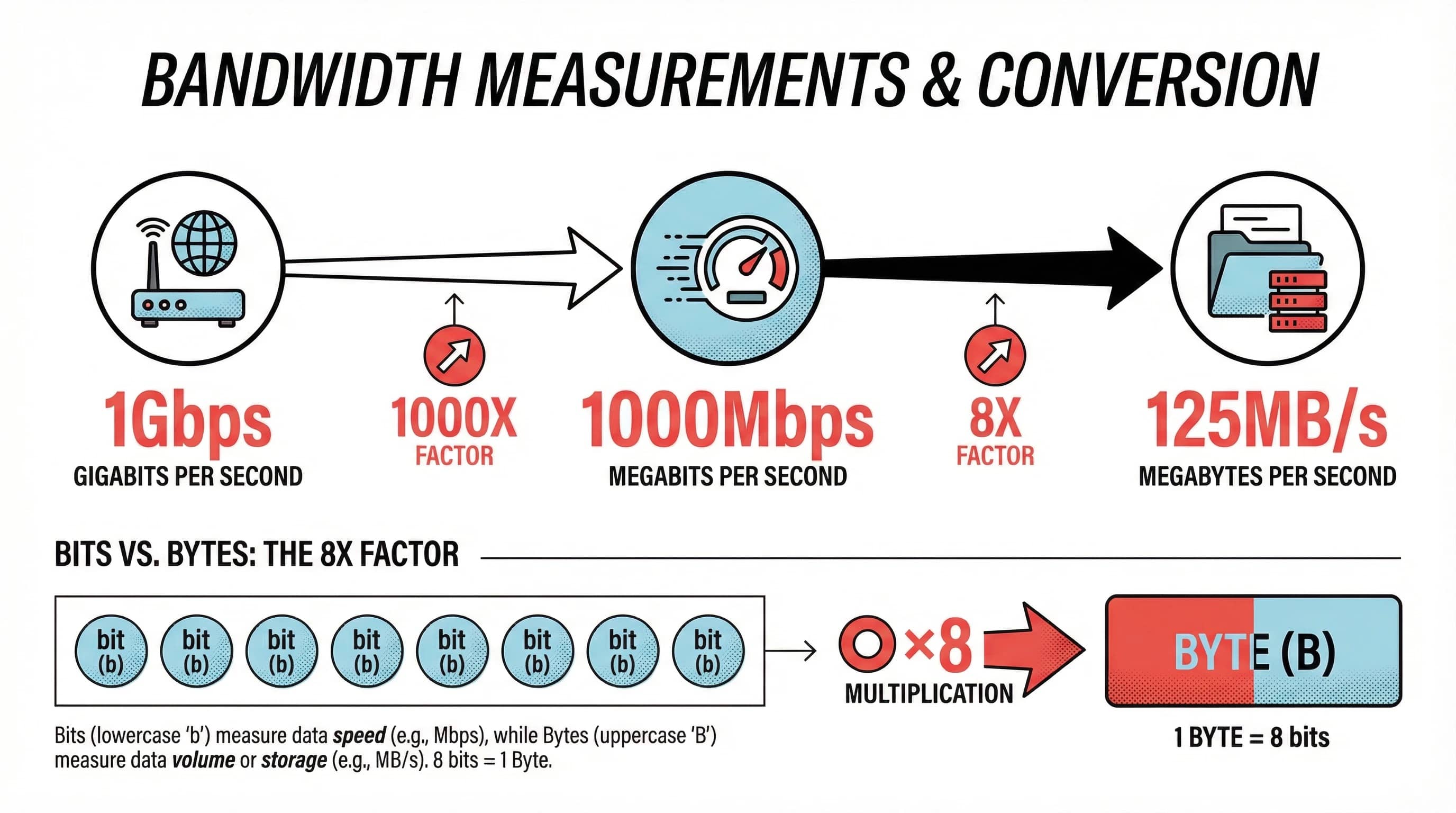 图3:单位换算图解 - 1Gbps = 1000Mbps = 125MB/s。注意bit(b)和Byte(B)的8倍差异,这是很多人被"骗"的根源。