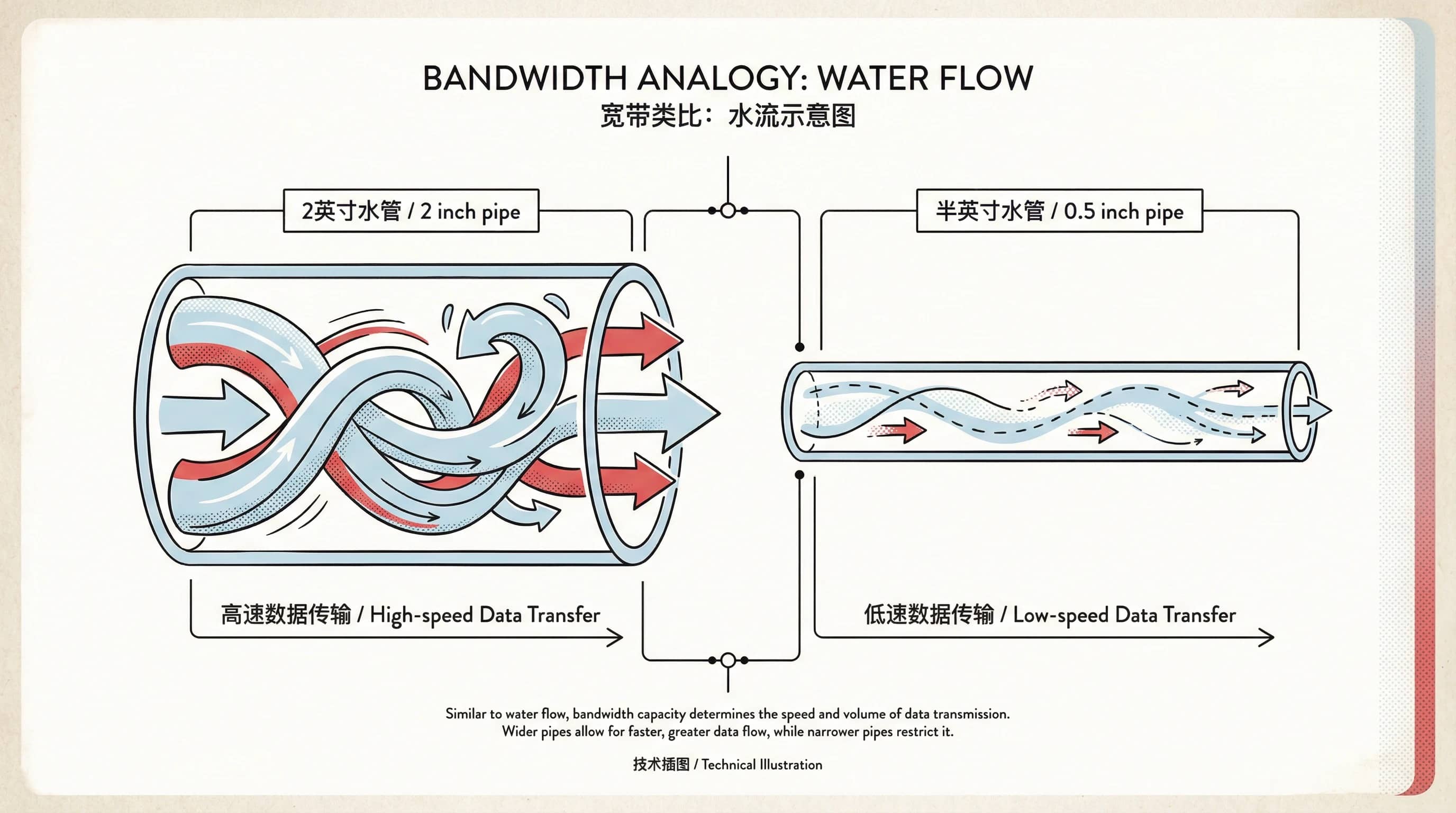 图1:水管比喻 - 即使安装了粗水管,如果主管道细或用水高峰期,实际水流依然有限。带宽(管道直径)≠ 下载速度(实际水流)。