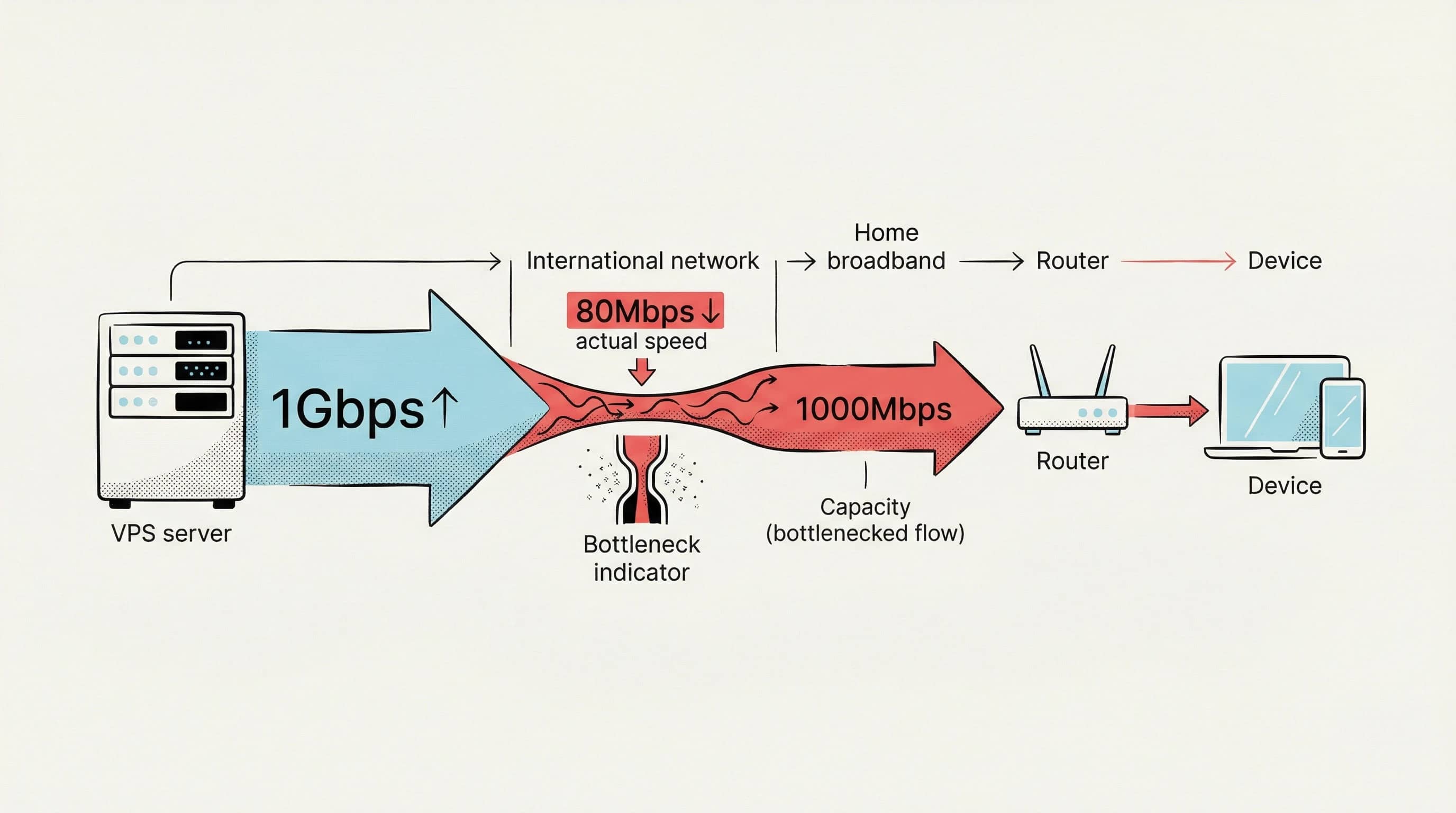 VPS服务器(1Gbps) → 国际网络 → 你家宽带(1000Mbps) → 路由器(千兆) → 设备