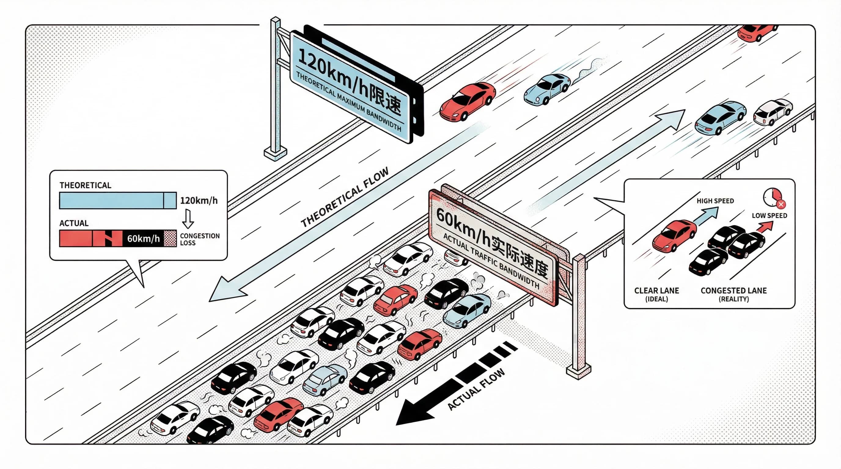 图2:高速公路比喻 - 8车道限速120km/h是理论上限,但堵车、收费站、车辆性能等现实因素会让实际速度远低于设计值。